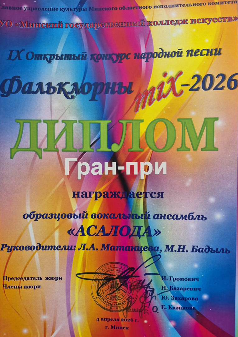 Узорны вакальны ансамбль "Асалода"стау абсалютным пераможцам конкурсу у намiнацыi "Ансамблевыя спевы". Кiраунiкi ансамбля Матанцава Л.А. ,Бадыль М.Н., канцартмайстар Фалевiч М.В. адзначаны падзякай "За педагагiчнае майстэрства, за уклад у развiццё народна-песеннага мастацтва i захаванне фальклорных традыцый".