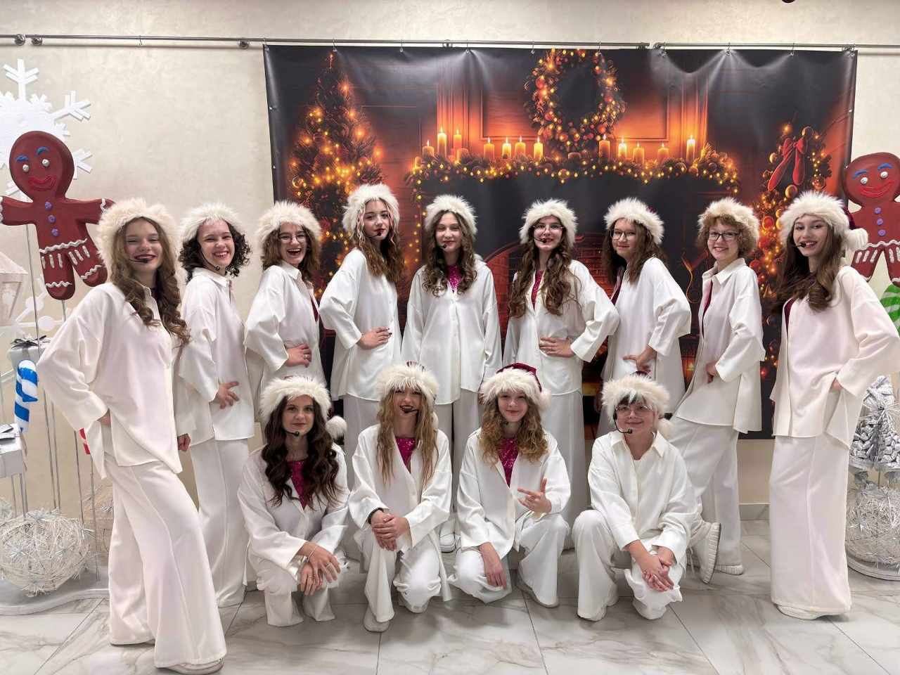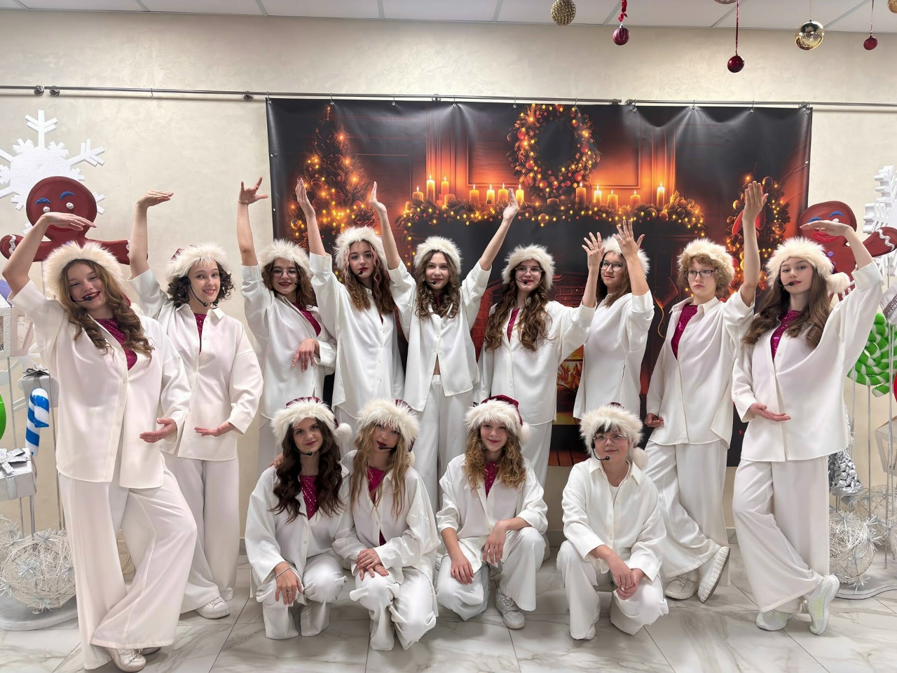 Ярким финалом новогоднего представления стало выступление детского образцового вокального ансамбля " Попробуй на 5!" ГУО " Солигорская детская школа искусств ".